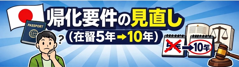 帰化申請の前提となる居住期間が、従来の「5年」 から「10年」とする厳格化案を政府が検討中です。